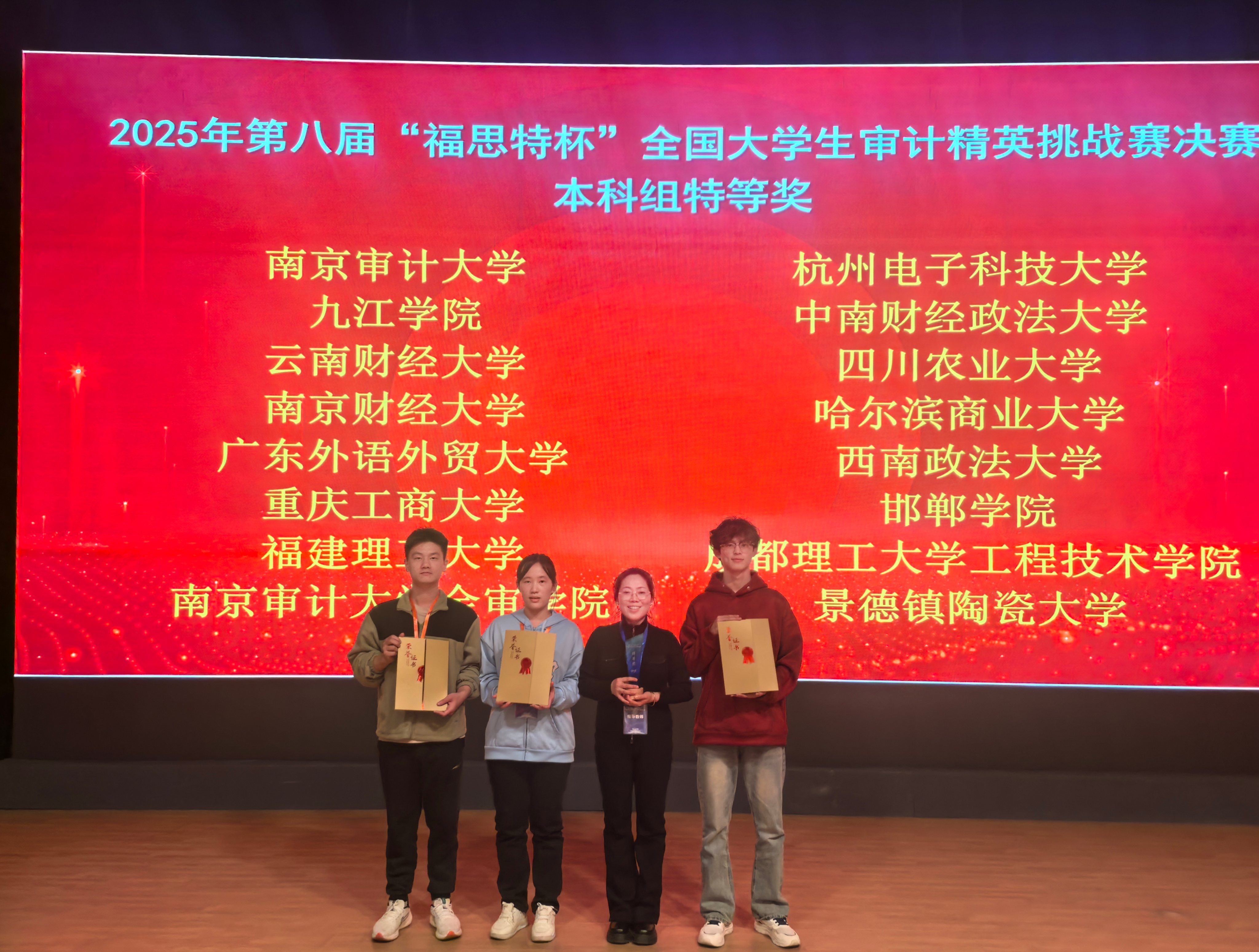 本网讯(管理与经济学院 叶珍媖)11月29日,第八届“福思特杯”全国大学生审计精英挑战赛在南京审计大学圆满落幕。我校管理与经济学院2022级会计专业学生胡明颖、熊世豪和2023级会计专业学生邹加良(指导老师:叶珍媖)代表我校参赛,最终荣获总决赛本科组特等奖。